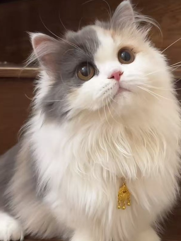 有这样一位优雅的精灵,它那如云朵般轻柔的长毛,每一根都仿佛被精心梳理过。独特的毛色分布,让它无论走到哪里都格外引人注目。它偶尔抬头,那澄澈的眼神,好似能看透你的心思,脖间晃动的金色配饰,更是为它的优雅气质加分不少。这只猫咪颜值超高呀,灰白与白色相间的毛发蓬松柔软,大眼睛仿佛藏着星辰,脖子上的金色小配饰,更是给它增添了几分贵气。绝对的颜值担当,用自己的魅力,俘获着每一位的心。